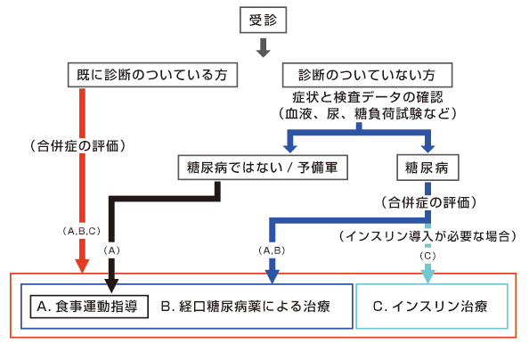 糖尿病は初期から末期まで経過が長い病気で、無症状のうちに病気が進行し、やがては循環器、脳血管、腎臓などの重大な病気をおこします。しかも心、脳、腎、神経、眼など様々な臓器に障害が出現します。症状も治療法も時期によって様々です。症状や進行度に合わせた適切な診断と治療が必要ですが、これは経験と知識に富んだ専門医にしか無理といえます。